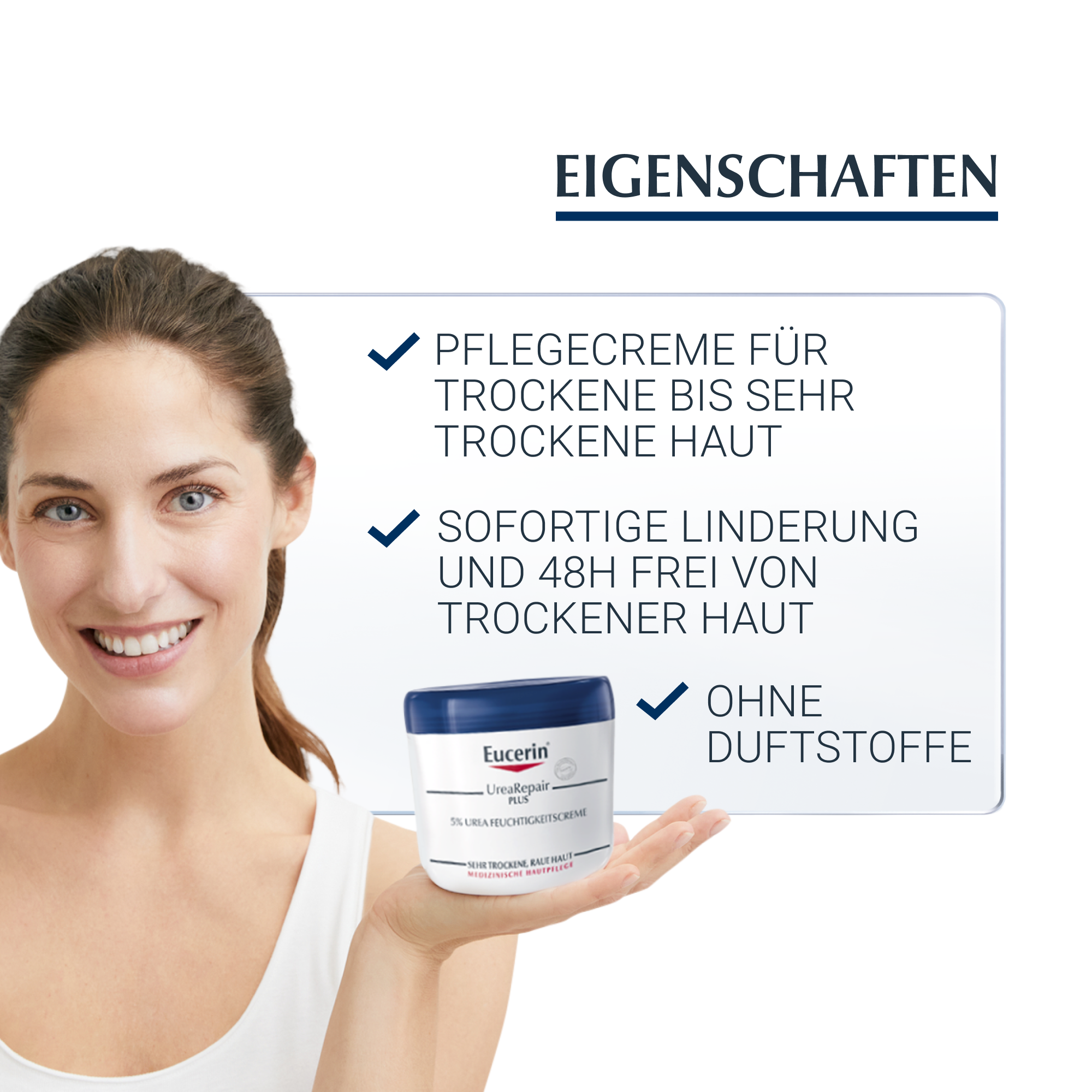 Die Eucerin UreaRepair 5% Urea Feuchtigkeitscreme ist eine Pflegecreme für sehr trockene Haut und eignet sich für die Anwendung am gesamten Körper.